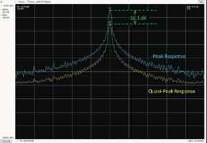 盡管許多EMI測量可以使用簡單的峰值檢波器完成,但EMI測量標(biāo)準(zhǔn)規(guī)定了一種專用測量方法,即準(zhǔn)峰值(QP)檢波器。QP檢波器用來檢測信號包絡(luò)加權(quán)后的峰值(準(zhǔn)峰值)。它根據(jù)信號時長和重復(fù)率加權(quán)多個信號。QP檢波器的特點是響應(yīng)快、衰減慢,包含一個表示臨界阻尼表的時間常數(shù)。發(fā)生頻次較高的信號,其QP測量值要高于偶發(fā)的脈沖。