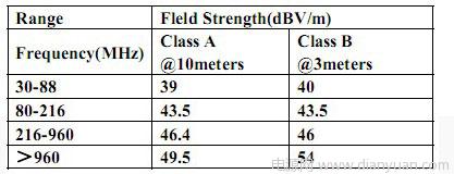 EMI測試是在特定的電波暗室中進(jìn)行的,測量由產(chǎn)品中輻射出來的電磁波強(qiáng)度,與FCC等規(guī)范相比較,不得超過規(guī)定的最大能量。FCC規(guī)范中將產(chǎn)品按用途分為CLASS A 、CLASS B 兩大類,A 類為用于商務(wù)或工業(yè)用途的產(chǎn)品,B 類為用于家庭用途的產(chǎn)品, FCC 對 B 類產(chǎn)品法規(guī)要求更嚴(yán)格。下表顯示的是FCC 規(guī)范的CLASS A和CLASS B標(biāo)準(zhǔn):