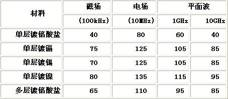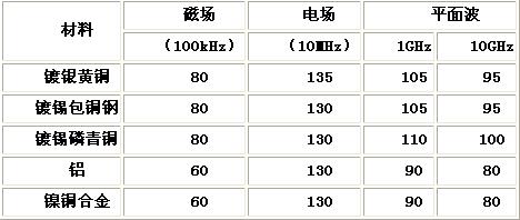 表1 場(chǎng)源距離不同材料的屏蔽體(厚度0.254mm)30cm遠(yuǎn)的屏蔽效能dB