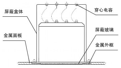 合理布置設(shè)備內(nèi)各單元及元器件的位置,可以做到既經(jīng)濟(jì)又實(shí)用地減小干擾程度。首先必須明確干擾源和受感器,在本設(shè)備中干擾源是控制保護(hù)器,敏感設(shè)備是數(shù)字電流表和電壓表,為了避免二者緊鄰,把它們分別放置于機(jī)箱的后部和前部,用空間距離減弱彼此的電磁干擾。為了達(dá)到更有效的屏蔽效果,又在電流、電壓表的表體外圍罩有屏蔽盒,表頭緊貼前面板的屏蔽玻璃,玻璃的絲網(wǎng)毛邊通過螺裝金屬外框?qū)⑺蜋C(jī)箱、屏蔽盒聯(lián)成一體,從而使表體完全處于電氣連續(xù)的金屬罩中( 如圖1 所示) ,而電流、電壓表引線則由裝在屏蔽盒上的穿心電容引入,這樣使引線所感應(yīng)的干擾信號(hào)被旁路接地。同樣控制保護(hù)器也用屏蔽盒對(duì)其進(jìn)行了屏蔽,進(jìn)一步減小了它對(duì)外的輻射能量,從而獲得較好的屏蔽效果。