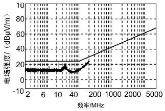 對(duì)RE102 試驗(yàn)項(xiàng)目進(jìn)行觀察,發(fā)現(xiàn)測試結(jié)果圖的超標(biāo)點(diǎn)為24 MHz、36 MHz 兩點(diǎn),而這兩點(diǎn)分別是12 MHz 頻率點(diǎn)的二三次諧波。為了找到這一頻率點(diǎn)的元器件,對(duì)機(jī)箱內(nèi)各單元進(jìn)行了分析,發(fā)現(xiàn)控制保護(hù)單元中有一個(gè)12MHz 晶振,由于晶振屬于高噪聲元器件,能夠產(chǎn)生較強(qiáng)的輻射,從而使其周邊充滿著近場輻射場。如果輻射場內(nèi)有器件或走線,晶振及其諧波信號(hào)將耦合到器件或走線上而輻射出去;再者又發(fā)現(xiàn)控制保護(hù)單元的PCB 板未采取就近接地措施,只是通過一根長引線和機(jī)殼地相連,造成信號(hào)的環(huán)路面積增大,產(chǎn)生了很強(qiáng)的輻射,所以對(duì)控制保護(hù)單元采取措施應(yīng)該是行之有效的。首先對(duì)晶振進(jìn)行屏蔽且屏蔽體就近接地,弱化輻射發(fā)射強(qiáng)度; 然后控制保護(hù)單元的PCB 板同樣采取就近接地措施,并且在屏蔽盒出口處的信號(hào)線上安裝一個(gè)鐵氧體磁環(huán),可以將不需要的高頻干擾抑制掉。通過采取以上措施后,RE102 試驗(yàn)指標(biāo)合格,如圖3 所示。