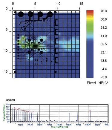 極近場掃描系統(tǒng)完成了空間和頻譜掃描后顯示并生成了以下輻射特性圖。需注意的是,掃描結(jié)果疊加在Gerber設(shè)計(jì)文件上,因此這樣對結(jié)果進(jìn)行分析可以立即確定待測器件中的具體輻射體。圖2顯示了SSCG功能為“關(guān)”時(shí)待測器件的輻射特性。