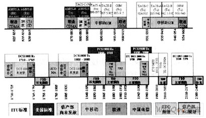 我國(guó)現(xiàn)有的無(wú)線與移動(dòng)通信頻譜具體分配情況如圖1所示,此外,WLAN使用無(wú)需許可的ISM頻段,UWB使用3.5/5.8G頻段,而WiMAX和RFID尚未最終確定頻段,其 中WiMAX有可能分配在2.5G、3.5G或5.8G頻段。