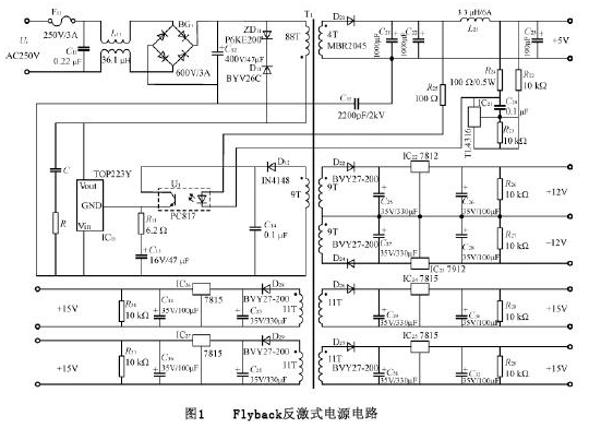 輸入為交流220V,經(jīng)功率二極管整流橋變?yōu)橹绷髯鳛榉醇ぷ儞Q器的輸入,輸出為三組直流:+5V,15V,12V,另外有一輔助電源5V,用來給光耦PC817供電??刂齐娐酚梅答伩刂?,選用TOPSwicth系列的TOP223Y芯片。