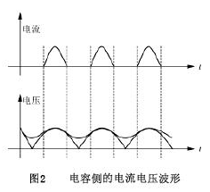 本電路中,交流輸入電壓Ui經(jīng)功率二極管整流橋變?yōu)檎颐}動電壓,經(jīng)電容C12平滑后變?yōu)橹绷?,但電容電流的波形不是正弦波而是脈沖波。如圖2所示?! ?br />
