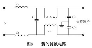 本電路主要的EMI問題是電源噪聲傳入電網(wǎng),將原來的共模扼流圈L11與電容C11及C12組成的濾波電路變?yōu)槿鐖D6所示電路。L1,L2,C1可除去差模干擾,L3,C2,C3可除去共模干擾。L1,L2為不易磁飽和的材料;C1可選陶瓷電容;L3為共模扼流圈;選定C=C2=C3及截止頻率fo,則可根據(jù)L3=1/〔(2πfo)2C〕計算L3;選定C1及截止頻率fo,可根據(jù)L1=L2=1/〔2(2πfo)2C1〕計算L1及L2。