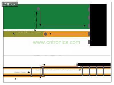 流經(jīng)所布線路的所有電流都有相等的回流。耦合策略固然很多,不過回流通常流經(jīng)相鄰的接地層或與信號線路并行布置的接地。在參考層繼續(xù)時(shí),所有耦合都僅限于傳輸線路,一切都非常正常。不過,如果信號線路從頂層切換至內(nèi)部或底層時(shí),回流也必須獲得路徑。