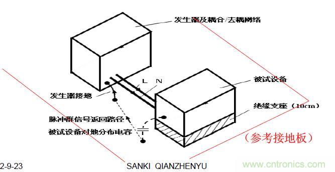 ③ 試驗(yàn)儀器(包括脈沖群發(fā)生器和耦合/去耦網(wǎng)絡(luò))放在參考接地板上。試驗(yàn)儀器用盡可能粗短的接地電纜與參考接地板連接,并要求在連接處的阻抗盡可能地小。
