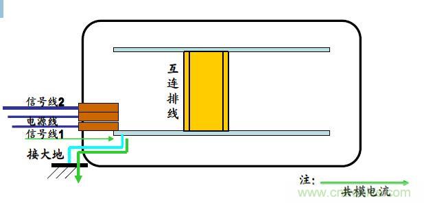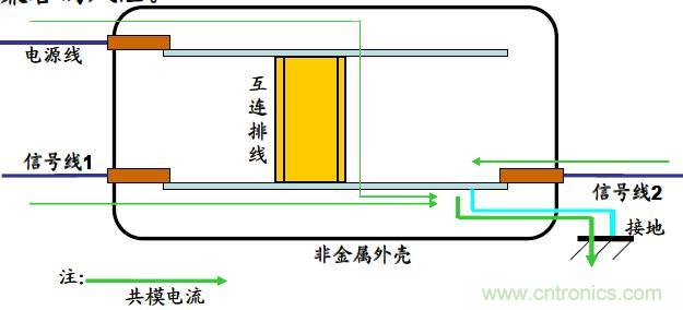 結(jié)構(gòu)和接地也是抑制脈沖群干擾的很重要的方面。圖示為一個(gè)非金屬外殼的電子設(shè)備,首先電源線遠(yuǎn)離接地點(diǎn),接地路徑較長(zhǎng),接地效果大大降低。其次,信號(hào)線1遠(yuǎn)離接地點(diǎn),導(dǎo)致干擾脈沖施加在電源線和信號(hào)線1上時(shí),脈沖群的共模干擾電流要經(jīng)互連線和下面的線路板,最終經(jīng)接地端子入地。由于互連線的阻抗較大,而且接地路徑又長(zhǎng)(接地阻抗也大),大大增加了電磁兼容的風(fēng)險(xiǎn)。