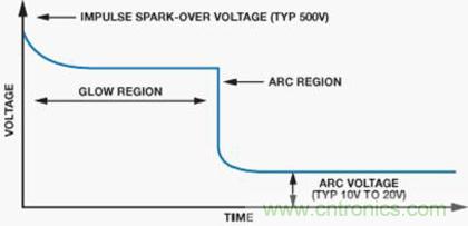 圖9顯示GDT的典型特性。當GDT兩端的電壓增大時,放電管中的氣體由于產(chǎn)生的電荷開始電離。這稱為輝光區(qū)。在此區(qū)域中,增加的電流將產(chǎn)生雪崩效應(yīng),將GDT轉(zhuǎn)換為虛擬短路,允許電流通過器件。在短路事件中,器件兩端產(chǎn)生的電壓稱為弧電壓。輝光區(qū)和電弧區(qū)之間的轉(zhuǎn)換時間主要取決于器件的物理特性。
