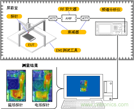 我們將EMI測試工具的電場探針和磁場探針通過RF放大器連接到頻譜分析儀,并對相鄰電磁場的分布進(jìn)行了分析。