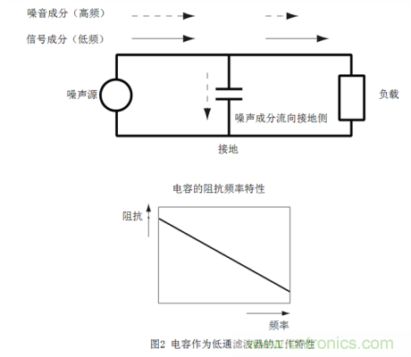 低通濾波器如果要利用該特性,就需要將電容插入噪聲通道與地線之間。如此一來,低頻信號能夠照常通過,高頻噪聲成分因接地側(cè)的阻抗較低,將流向接地側(cè),從而達(dá)到降噪效果。