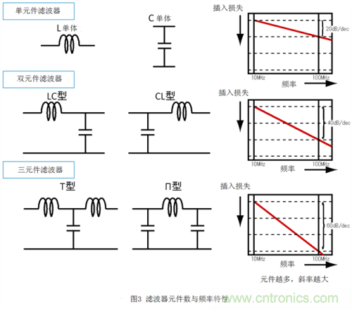 圖 3顯示了組成濾波器的元件數(shù)與濾波器頻率特性之間的關(guān)系。想知道什么是插入損耗,可以看一下圖中各濾波器的信號衰減量,圖越往下衰減量越多。從圖上我們可 以看到,濾波器中的元件越多,頻率特性的斜率就越大。元件較少的濾波器的頻率特性范圍較窄(斜率較小),衰減頻率及通過頻率的選擇度較低,有可能導(dǎo)致部分 信號衰減或者噪聲沒有徹底去除。另一方面,元件較多的濾波器的頻率特性范圍較寬(斜率較大),頻率的選擇度較高,信號可以在幾乎不衰減的狀態(tài)下去除噪聲。