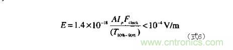 要想精確計(jì)算一個數(shù)字產(chǎn)品的輻射強(qiáng)度等級是件不現(xiàn)實(shí)的事情,因?yàn)橛刑嗟囊蛩貢绊懡Y(jié)果。下式表示了一個簡單的約束條件:開放的測量試驗(yàn)場合,30MHZ以上,滿足FCC和VDE輻射限制的環(huán)路面積、峰值電流和上升時間。