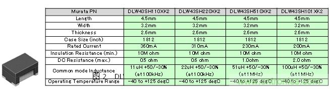 關(guān)于CAN中的噪聲對(duì)策產(chǎn)品,村田公司已經(jīng)將對(duì)應(yīng)的共模扼流圈DLW43SH系列產(chǎn)品化。該系列產(chǎn)品的外觀以及主要特征如圖2所示。DLW43SH系列是使用在CAN和FlexRay等車(chē)載LAN中的噪聲對(duì)策用共模扼流圈,是尺寸為4.5×3.2×2.6mm的表面貼裝品。特性值最大為100μH的共模電感,此外,DLW43SH的截止頻率約為1000MHz,可對(duì)應(yīng)高速差分信號(hào)對(duì)高頻的要求。使用溫度范圍在-40~+125℃,因此適用于車(chē)載的廣泛應(yīng)用。