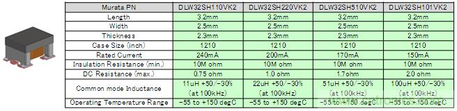 作為DLW43SH系列的小型化產(chǎn)品,DLW32SH系列目前正在開(kāi)發(fā)中。該系列的外觀以及主要特性如圖3所示。DLW32SH系列的尺寸為3.2×2.5×2.3mm具有小尺寸特點(diǎn),并且與DLW43SH系列相比,可實(shí)現(xiàn)同等性能。其構(gòu)造的特征是在產(chǎn)品端子部分使用了金屬支架,可以緩和由于溫度變化產(chǎn)生的熱伸縮影響,適用的溫度范圍達(dá)到了-55~+150℃。
