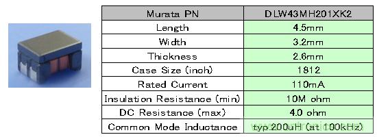此外,村田公司目前正在開(kāi)發(fā)作為車(chē)載Ethernet用共模扼流圈的DLW43MH系列。該產(chǎn)品的外觀以及主要特性如圖4所示。DLW43MH系列的尺寸和DLW43SH系列同為4.5×3.2×2.6mm,共模電感值提高到了200μH,因此在較寬的頻帶中能起到有效的噪聲對(duì)策效果。由于在繞線上下足了功夫并且改善了共模轉(zhuǎn)差模噪聲,因此噪聲改善效果會(huì)更加好。