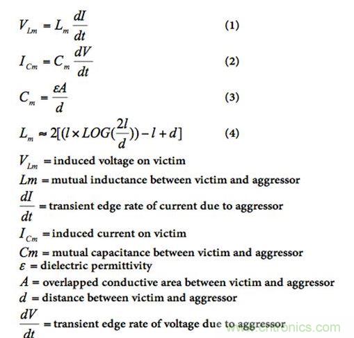 方程式(1)和(2)分別是入侵信號對受害信號的感應(yīng)電壓和電流計算公式,方程式(3)和(4)分別是入侵信號和受害信號之間的互電容和互電感計算公式。
