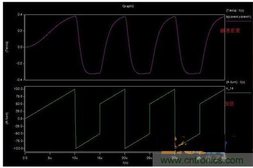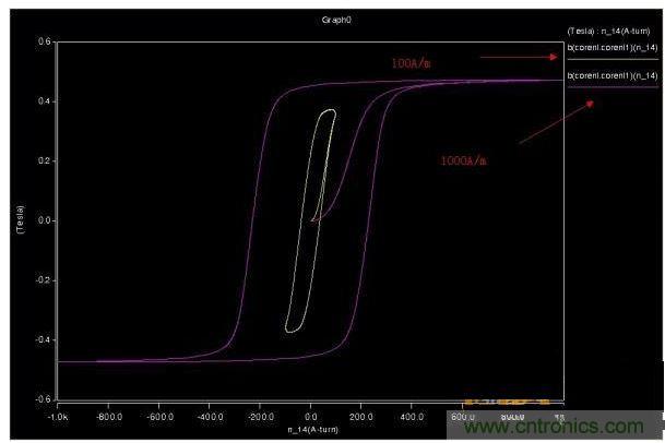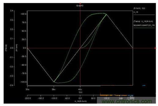 2、仿真CCM模式,磁滯回線(xiàn)上會(huì)出現(xiàn)兩個(gè)安匝跳變位置,但是磁通密度并不能跳變,而是通過(guò)下降來(lái)釋放能量。