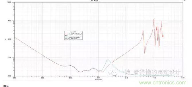 圖2是把電容安裝到一個(gè)6層板上面,層疊如左圖所示,4、5層是電源地平面對(duì),右圖是安裝之后仿真的諧振頻率,大約是10M左右