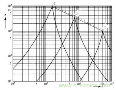 由圖中可以看出,電感線圈的阻抗開始的時(shí)候是隨著頻率升高而增大的,但當(dāng)它的阻抗增大到最大值以后,阻抗反而隨著 頻率升高而迅速下降,這是因?yàn)椴⒙?lián)分布電容的作用。當(dāng)阻抗增到最大值的地方,就是電感線圈的分布電容與等效電感產(chǎn)生并聯(lián)諧振的地方。圖中,L1 > L2 > L3,由此可知電感線圈的電感量越大,其諧振頻率就越低。從圖2中可以看出,如果要對(duì)頻率為1MHZ的干擾信號(hào)進(jìn)行抑制,選用L1倒不如選用L3,因?yàn)?L3的電感量要比L1小十幾倍,因此L3的成本也要比L1低很多。