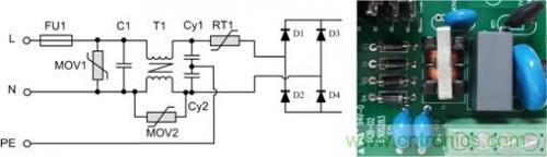 背景:以某型號(hào)的電源模塊為例,該模塊是周立功致遠(yuǎn)電子為某客戶定制的電源模塊,輸入85VAC~350VAC,且EMC前級(jí)電路電路嵌入到模塊中。抗浪涌要求差模電壓3KV,共模電壓6KV。更換更大的保險(xiǎn)絲后可承受6KV差模電壓。其前級(jí)原理圖及對(duì)應(yīng)實(shí)物圖如圖2所示