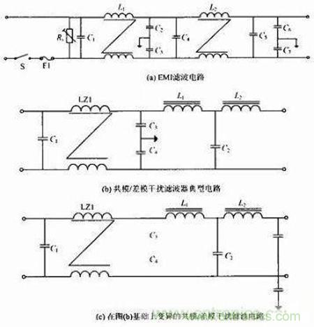 開關(guān)電源對(duì)內(nèi)、外的干擾及抗干擾中,共模信號(hào)與開關(guān)器件的工作方式、散熱器的安裝及整機(jī)PCB板與機(jī)殼的連接有相當(dāng)復(fù)雜的關(guān)系,共模信號(hào)在一定 的條件下又可轉(zhuǎn)變成差模信號(hào)。其中解決共模干擾除了上述一般的EMI濾波電路,還可按如下電路圖的思想在電路上改進(jìn),使開關(guān)電源能夠在電路上改進(jìn)從而提高 性能。圖1(b)為共模/差模干擾濾波器典型電路,圖1(c)為在圖1(b)基礎(chǔ)上變異的共模/差模干擾濾波電路。