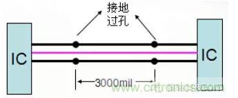 3、時鐘兩側(cè)建議包地線,包地線每隔3000mil接地,這樣保證包地線上各點電位相等。