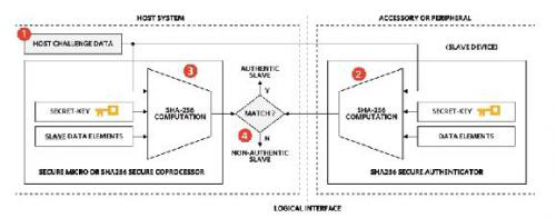 DS28C36和DS28E35等基于非對稱加密的產(chǎn)品提供更靈活的方法,因?yàn)橹鳈C(jī)側(cè)不需要防止密鑰被泄露。然而,為降低公鑰算法負(fù)荷并且提供附加安全操作,可利用DS2476 (DS28C36的配套IC)等主機(jī)側(cè)協(xié)處理器簡化系統(tǒng)方案的開發(fā)。