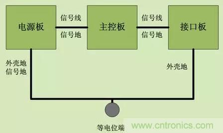 靜電要得到有效釋放,就要保證良好的接地。對于醫(yī)療電子,一般的醫(yī)療電子產(chǎn)品比如監(jiān)護儀,機身后面都會有一個等電位接地端。在做ESD試驗的時候,這個接地 端也是要接大地的,這樣就有了一個靜電快速泄放的途徑。如圖5.1,假如主電路板分為三個模塊:電源板,主控板和接口板,接口板的接口外殼地要和信號地分 開,然后接口板的外殼地和等電位端用粗導(dǎo)線相連。系統(tǒng)的信號地可以從電源板的外殼地與信號地相連然后共用一根粗導(dǎo)線與等電位端相連。之所以沒有采用每塊板 都分別接到等電位端的星形接地方法,是因為星形接地會形成接地環(huán)路,從而增加射頻噪聲和容易受電磁干擾。