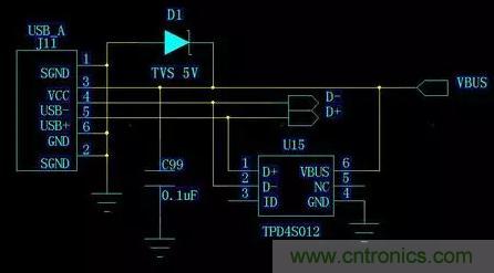 對外接口的信號線同樣需要保護,否則靜電經(jīng)過信號線直接到達芯片IO管腳,雖然芯片的IO都有二極管保護,一般可以抵御+-2KV的靜電,但是對于+-6KV的ESD接觸放電,就會遭遇損壞的風(fēng)險。同樣是USB接口,如圖2.1,差分信號線D+和D-接了個ESD器件TPD4S012,實際上是與USB電源和地并接反向二極管,把電流導(dǎo)向USB電源或者地。