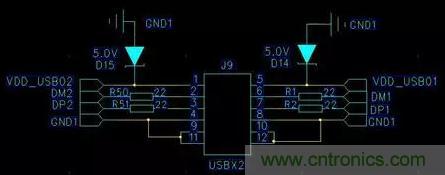 特別是對于裸露在外的一些接口,比如USB、VGA、DC、SD卡等,對這些接口進行接觸放電時,靜電很容易就會“串”到電源線上,靜電由本來的共模變成了差模,此時電源上就會產(chǎn)生一個很高的尖峰,很多芯片都承受不了,發(fā)生死機,復(fù)位等問題。對于電源VCC的ESD保護,可以并接TVS管來解決。TVS管與穩(wěn)壓二極管很相似,都有一個額定的電壓,不同的是它的響應(yīng)速度特別快,對靜電有很好的泄放作用。例如對于USB接口(見圖1.1、圖1.2),VCC和外殼地之間并接5V的TVS管。相當(dāng)于把電源和地鉗位在5V以內(nèi),這樣可以有效地把靜電電流導(dǎo)向地,達到效果很明顯。要注意的是布局布線的時候,TVS管要盡量靠近接口的位置,TVS的陰極以最近的路徑接到接口的外殼地(如果有的話)。