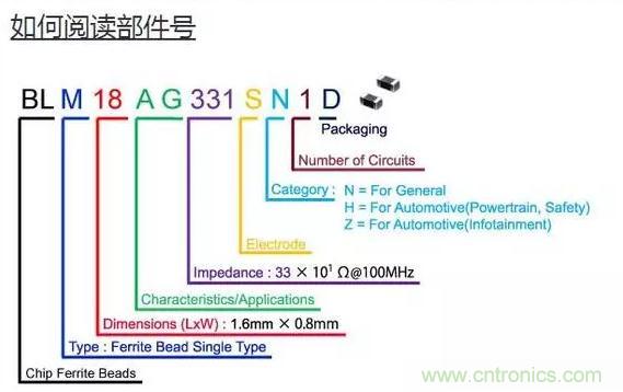 下圖以型號BLM18AG331SN1D為例說明磁珠的命名規(guī)則
