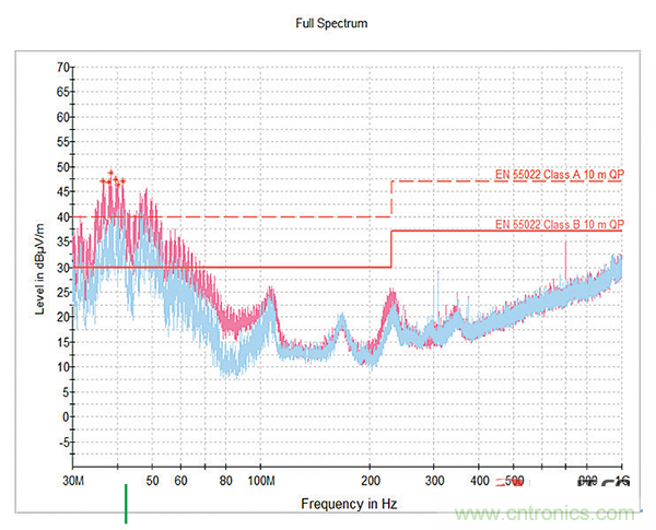 將圖7中的曲線圖看作是在沒有EMI濾波器的情況下測量的器件的噪聲輸出,這會導致出現代價昂貴的停產問題。值得注意的是,30MHz和70MHz之間的頻率超過了允許的限制,這意味著無論實際產品是否成功,設計都無法進入市場。盡管該設備具有屏蔽外殼,但該區(qū)域需要極其昂貴的重新設計或額外的濾波以將該噪聲降低到可接受的水平。