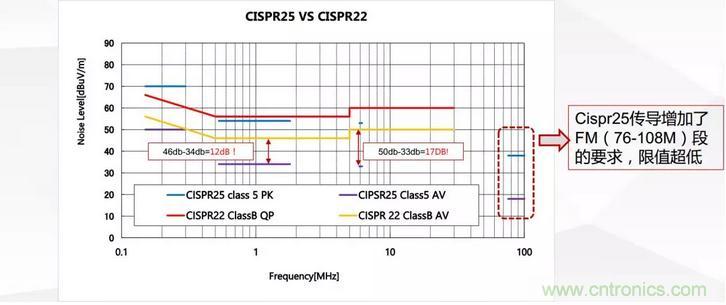 歷史上普遍接受的國際電磁干擾標準是CISPR-22,美國的電磁干擾標準是FCC,CISPR-22與FCC有所不同,但一般來說如果電源符合CISPR-22標準,那么它也符合FCC標準。總之CISPR-22標準已經(jīng)成為全世界都遵守的基本標準。汽車上的電磁干擾標準是CISPR-25,相對CISPR22來說CISPR-25標準限制值更低并且額外對FM頻段做了很嚴的限制要求。具體傳導測試限制要求如圖2所示。