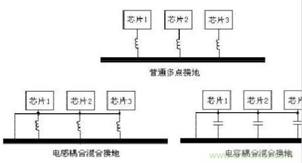 工作頻率高(>30MHz)的采用多點接地式(即在該電路系統(tǒng)中,用一塊接地平板代替電路中每部分各自的地回路),為了減小電感,要求地線的長度盡量短,在頻率很高的系統(tǒng)中,通常接地線要控制在幾毫米的范圍內(nèi)。每根接地線的長度小于信號波長的1/20。