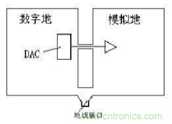 接地技術(shù)中還有一個很重要的部分就是數(shù)字電路與模擬電路的共地處理。一般說來,數(shù)字電路的頻率高,而模擬電路的對噪聲的敏感度強(qiáng),正因為如此,高頻的數(shù)字信號線要盡可能遠(yuǎn)離敏感的模擬電路器件,同樣,彼此的信號回路也要相互隔離,這就牽涉到模擬和數(shù)字地的劃分問題。一般的做法是,模擬地和數(shù)字地分離,只在某一點連接,這一點通常是在PCB板總的地線接口處,或者在數(shù)模轉(zhuǎn)換器的下方,必要時可以使用磁性元件(如磁珠)連接,如圖所示。