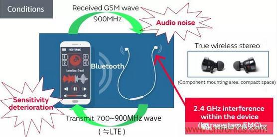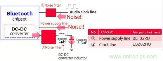 在這種情況下,我們引入了噪聲抑制的示例,其中同一電路中的噪聲干擾藍(lán)牙通信信號。該技術(shù)還可以應(yīng)用于以2.4 GHz頻率通信的非藍(lán)牙設(shè)備,我們已經(jīng)實(shí)現(xiàn)了噪聲抑制組件,這些組件在2.4 GHz的超小型x 0.4 mm x高頻范圍內(nèi)非常有效考慮到在添加組件時需要節(jié)省安裝表面積,需要0.2 mm。