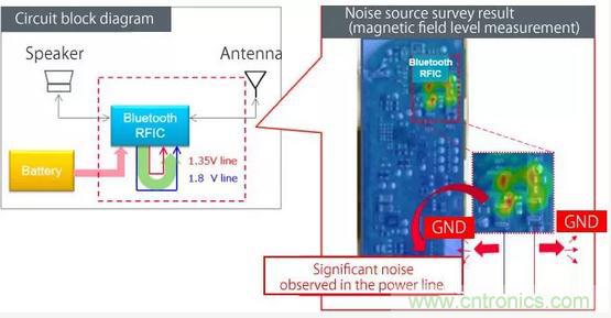 圖5顯示了用于測量的測量環(huán)境以及測量與藍(lán)牙天線耦合的噪聲的結(jié)果。觀察到極高水平的噪聲,這需要噪聲抑制以降低水平。實(shí)現(xiàn)藍(lán)牙噪聲抑制時,有兩個關(guān)鍵的實(shí)現(xiàn)區(qū)域。