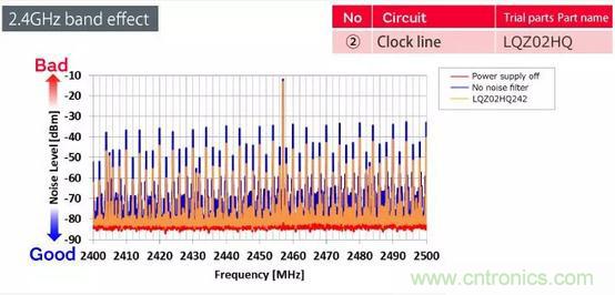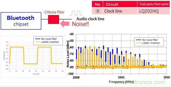 第一個區(qū)域是電源線,第二個區(qū)域是時鐘線。由于電源線由于切換而產(chǎn)生更高的諧波,并且時鐘信號的高次諧波延伸到2.4GHz頻帶,因此在藍(lán)牙信號中產(chǎn)生噪聲。濾波是抑制噪聲傳導(dǎo)的有效方法。