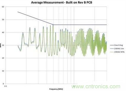 我通過簡單調(diào)整電路板(無電路變化),將噪聲降低了大約 6dB。見圖 2 和圖 3 的測量結(jié)果。在有些情況下,接近高 dV/dt 進(jìn)行輸入線路布線甚至還可擊壞共模線圈 (CMC)。