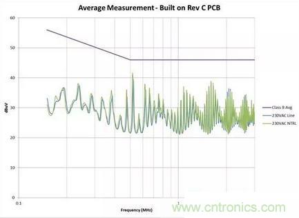 圖3:從電路板布局進(jìn)行 EMI 掃描,其中 AC 輸入與開關(guān)電路之間距離較大