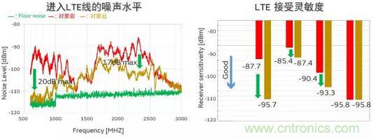 通過(guò)這些對(duì)策,如圖8所示,天線(xiàn)中進(jìn)入的噪聲最大可降低20dB,LTE的接收靈敏度取決于頻帶,改善了8dB。