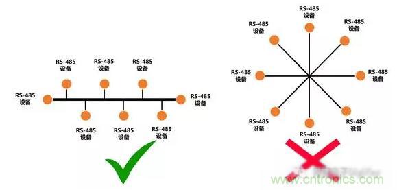 為了避免信號(hào)反射,在多個(gè)RS-485連接時(shí),支路長度(StubLength)越短越好。同時(shí)要避免其他類型的連接,比如星型連接。