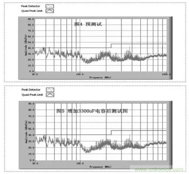 現(xiàn)場測試時(shí),在模塊電源VH2處增加一個(gè)3300uf的電解電容,發(fā)現(xiàn)對輻射的抑制作用明顯,特別是在30MHz至1000MHz區(qū)間對毛刺和能量頻譜的抑制作用明顯(見圖4和圖5)。電容值越大,對毛刺尖峰的抑制作用越明顯,濾波后的曲線越平滑。當(dāng)然,電容值的選擇需要按照實(shí)際的設(shè)計(jì)要求來定。