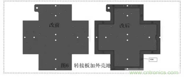 當(dāng)LED面陣驅(qū)動板增加兩層接地,由原先的4層板變成6層板,能起到較好防止輻射的作用。當(dāng)轉(zhuǎn)接板周邊附整邊銅箔,并與金屬箱體用螺釘緊固,形成外殼地,從而達(dá)到對信號起到屏蔽作用(圖6)。