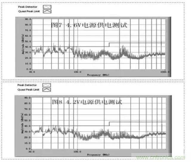因?yàn)閭鲗?dǎo)、輻射的數(shù)值與dv/dt 或者 di/dt成正比,所以電壓越高,傳導(dǎo)、輻射的數(shù)值越大。樣品的供電電壓是4.6V,當(dāng)電壓調(diào)整供為4.2V后,從實(shí)驗(yàn)數(shù)據(jù)可以看出,發(fā)現(xiàn)尖峰毛刺也能得到一定改善(圖7、圖8)。