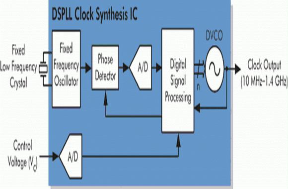 以DSP為基礎(chǔ)的鎖相回路技術(shù)(DSPLL)為振蕩器提供傳統(tǒng)設(shè)計(jì)無(wú)法實(shí)現(xiàn)的許多獨(dú)特功能。例如傳統(tǒng)做法須為不同頻率制造不同的HFF石英晶體或SAW諧振器,以DSPLL架構(gòu)為基礎(chǔ)的振蕩器(圖1所示)則能在所有產(chǎn)品中利用一顆規(guī)格較寬松的低頻石英晶體提供多頻操作能力,并將固定頻率振蕩器的輸出倍頻為使用者在10MHz到1.4GHz之間所指定的頻率。