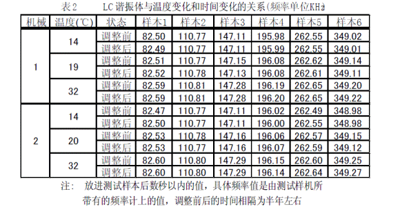 根據(jù)本文中所推出的原理試作了LC諧振頻率測(cè)試機(jī)分別對(duì)6個(gè)種類LC諧振體樣本(產(chǎn)品)進(jìn)行測(cè)試。本LC諧振測(cè)試機(jī)已應(yīng)用在6個(gè)種類LC諧振體的生產(chǎn)和產(chǎn)品檢驗(yàn)上。具體結(jié)果參照表1和表 2。