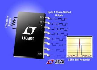 凌力爾特公司 (Linear Technology Corporation) 推出精確硅振蕩器LTC6909,該器件極大地降低了峰值輻射 EMI,并在多相電源中改善了開(kāi)關(guān)穩(wěn)壓器的控制。LTC6909 有 8 個(gè)獨(dú)立輸出,提供多達(dá) 8 個(gè)軌至軌 50% 占空比時(shí)鐘信號(hào)。這些輸出可以用來(lái)啟動(dòng)或禁止以及實(shí)現(xiàn)多個(gè)開(kāi)關(guān)穩(wěn)壓器的相位同步。相位同步提供多種設(shè)計(jì)優(yōu)勢(shì),包括改善的 EMI 性能、降低的輸入和輸出紋波電流、以及更好的負(fù)載瞬態(tài)響應(yīng)。使用 3 個(gè)邏輯輸入,這些輸出之間的相位關(guān)系可以從 45o 至 120o 配置,或者輸出可以被置于邏輯低或高 Z 狀態(tài)。